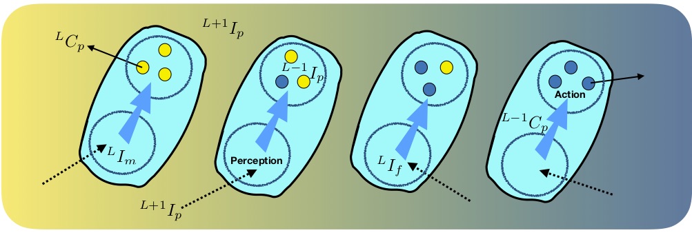 I had to develop a notation for dealing with multi-level causation when interpreted as the constraint of action of forces by embodied information (relative coordinates of component particles). In the illustration below (from [8], inspired by Mike Levin's work in developmental biology), the formation of a tissue (organisational level L+1) from individual cells (L) is mediated by molecular level (L-1) physical causes that scale up by diffusion to form a gradient in hormone concentration, embodying information at L+1, which is 'perceived' by cells, becoming internalised information that constrains the internal molecular (L-1) process, thus illustrating both upward (emergence) and downward causation.